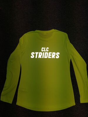 CLC Striders club badge printed on left chest pocket with the new logo and club name printed across the back in reflective writing. Available in fluorescent yellow only